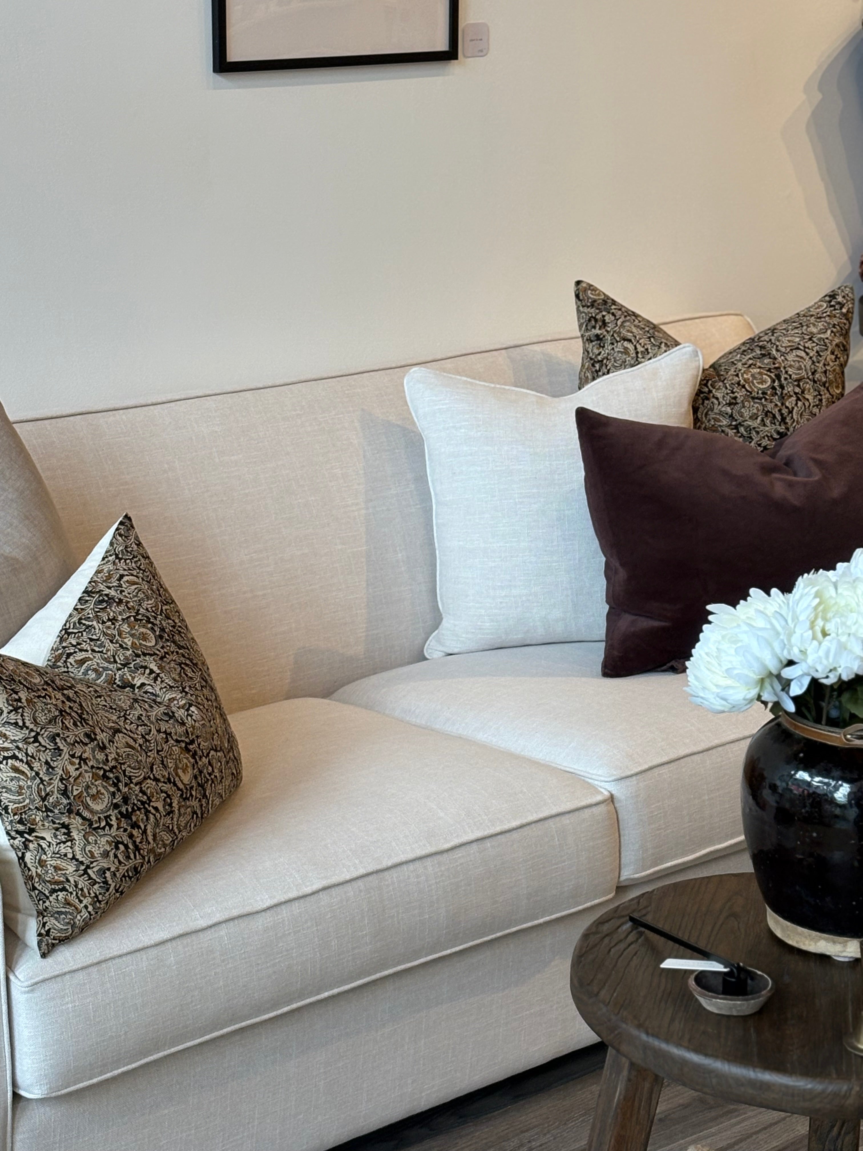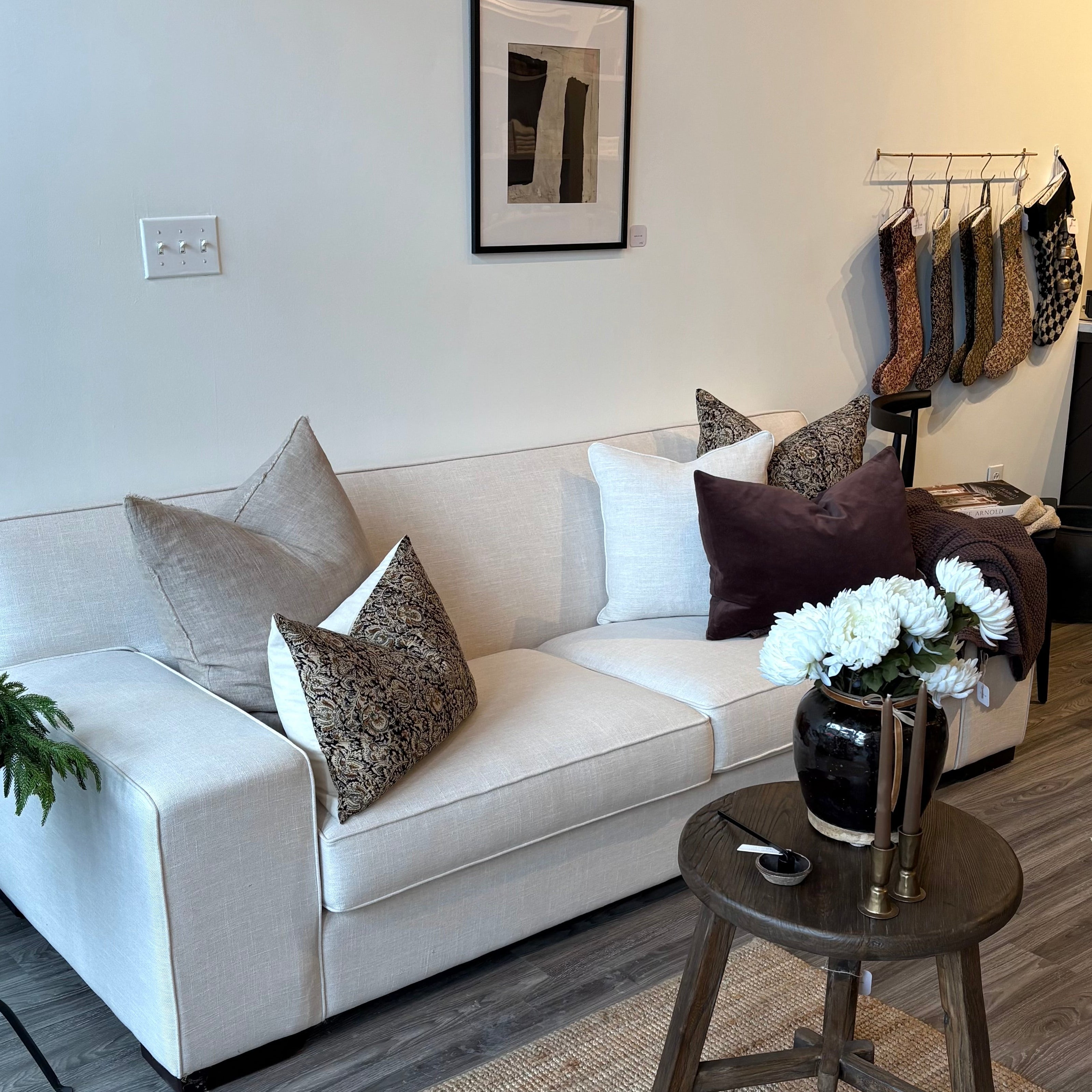 Merging minimalist design with inviting comfort, this unique design features no back cushions. Clean lines for days but without the sacrifice in comfort. Done in a warm Campbell Cream Fabric.