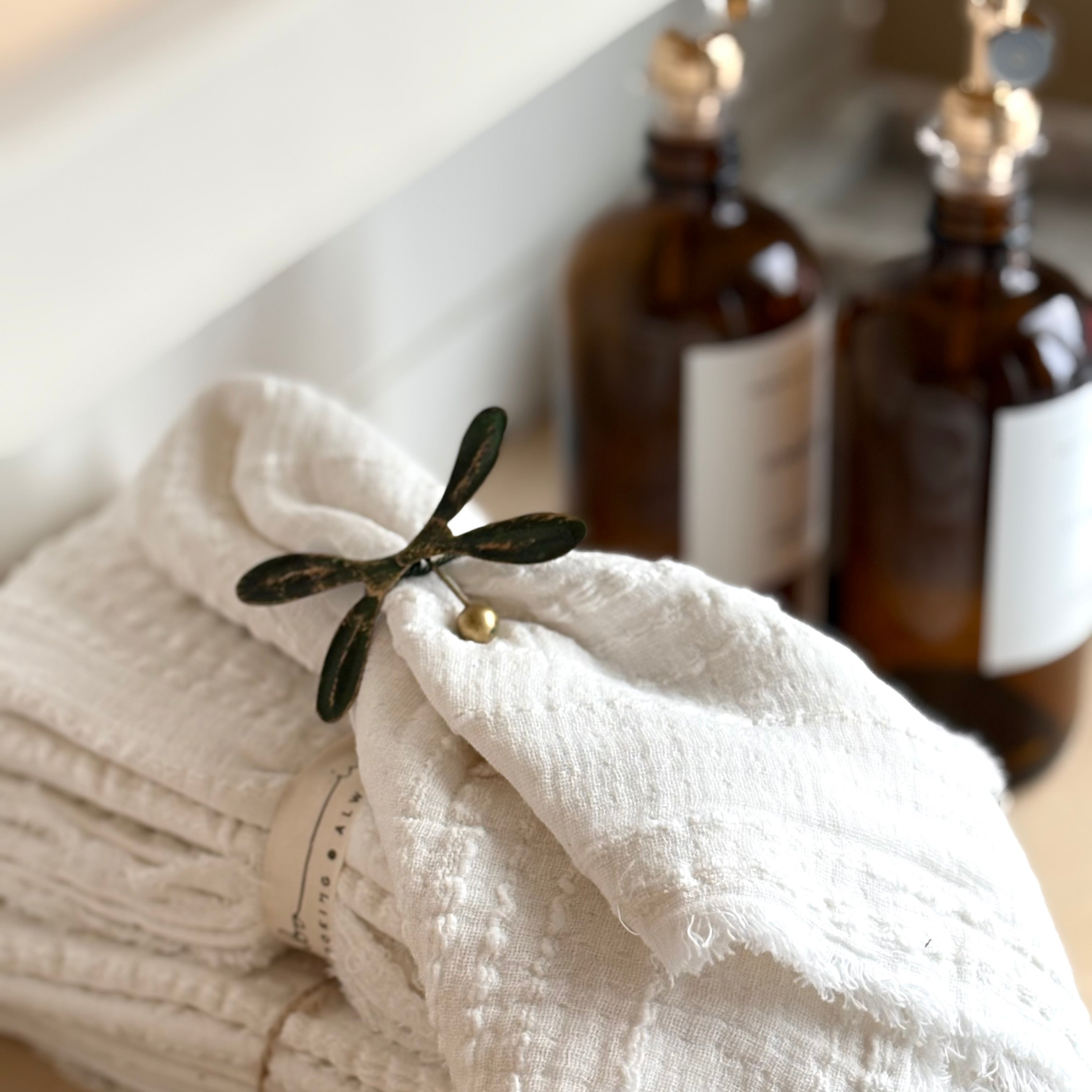 Infuse a subtle festive ambiance into your holiday tablescape with the Mistletoe Napkin Ring. With an antique patina finish that gives it the timeless feel of a cherished collection piece, it adds charming elegance when wrapped around a napkin at your place setting.