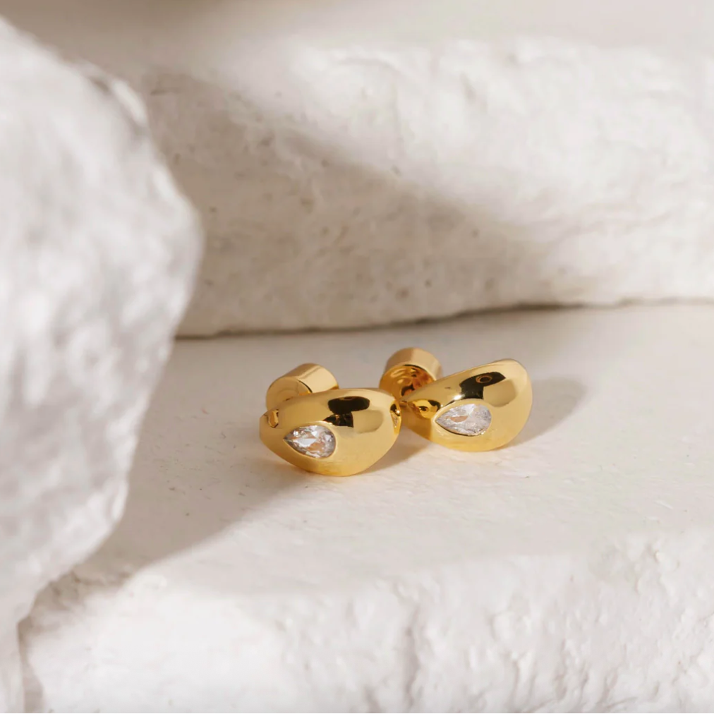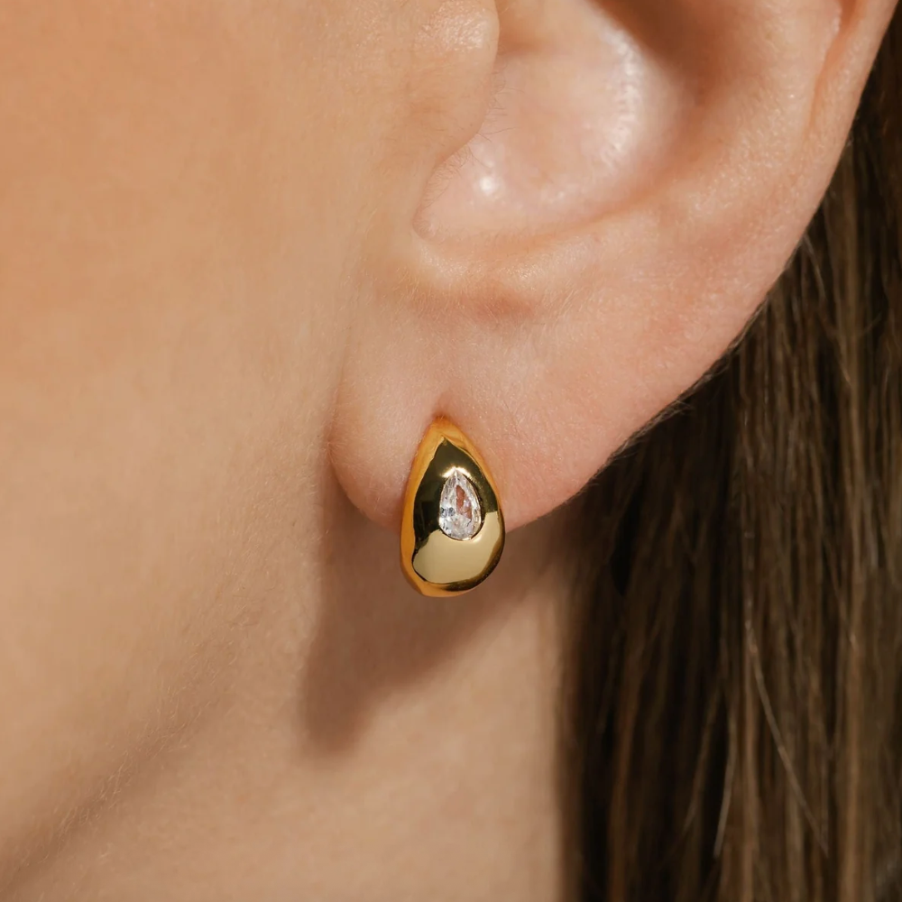 The Amadora Huggie earring with crystal accents is a graceful accessory that elevates any look. A teardrop-shaped crystal adorns a delicate golden curve, adding just the right amount of glamour to take you from day to night. Sold as a pair.