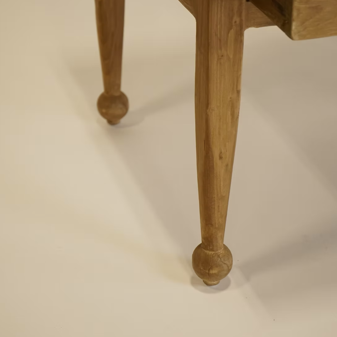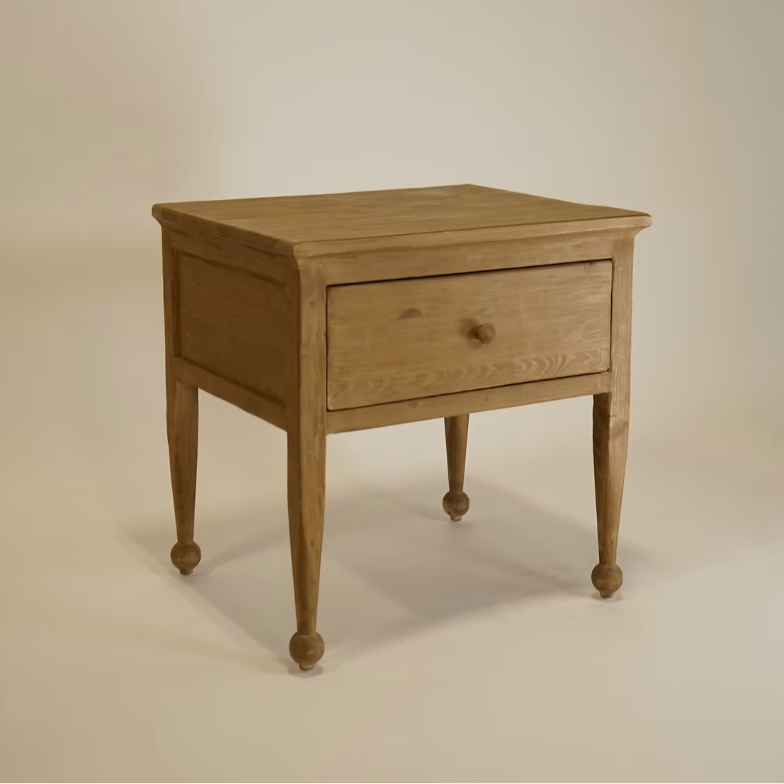 The Margot side table carries a timeless character in an elegant form. Crafted from reclaimed pine, its natural variations and weathered charm make every piece unique. Designed with a single drawer, it’s perfectly suited for bedside essentials — offering both function and style. With its softened lines and classic silhouette, the Margot Side Table feels equally at home styled next to a bed, tucked into a reading nook, or layered into a living space.